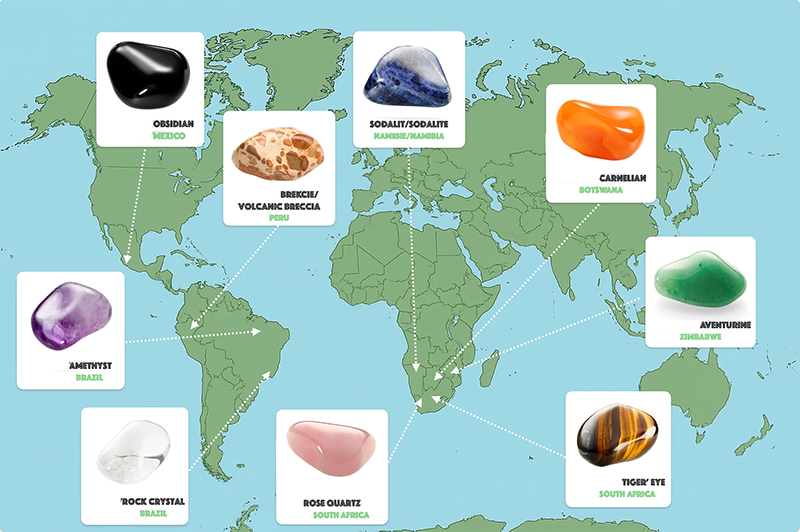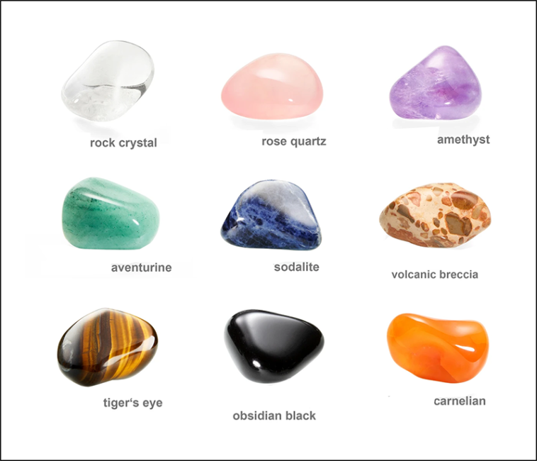 Cristal de roca - Cuarzo rosa - Amatista - Aventurina verde - Sodalita - Ojo de tigre - Obsidiana negra - Cornalina - Jaspe brechado volcánico