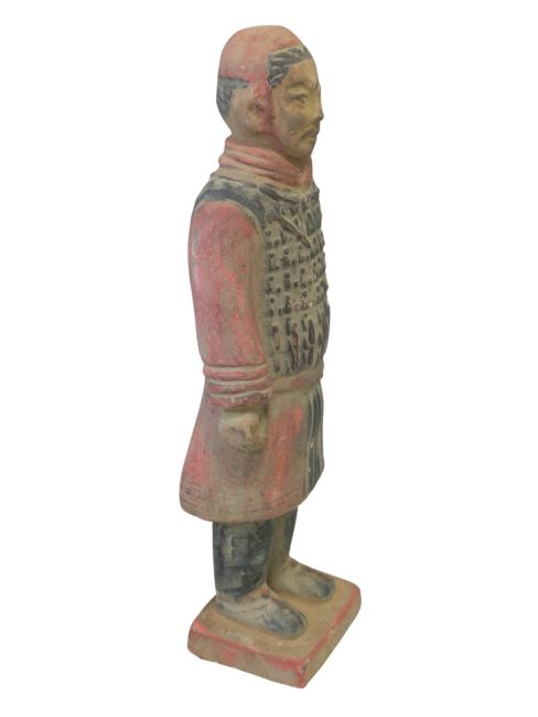 Las estatuas de terracota de guerreros y caballos, de gran realismo, representan fielmente su apariencia en el momento de su descubrimiento. El proceso de envejecimiento es mucho más complejo que el de las estatuas comunes, requiriendo un trabajo meticuloso y una cantidad considerable de tiempo. Para lograr una apariencia auténtica, deben enterrarse durante un tiempo, luego desenterrarse, exponerse a la intemperie y restaurarse. Solo después de este proceso de erosión natural se puede lograr un efecto realista. Por lo tanto, su valor es considerablemente alto debido a la complejidad y autenticidad del proceso de fabricación.