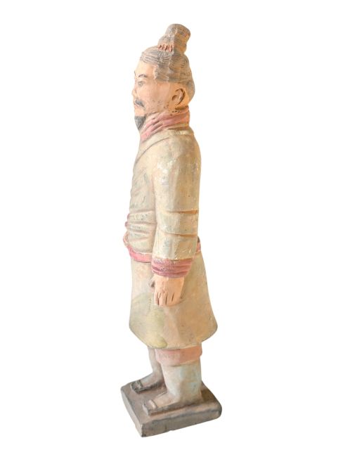 Guerrero en uniforme de batalla: Estas estatuas representan una categoría de soldado entre las estatuas de terracota del ejército. Generalmente se representan como soldados vestidos con ropa de batalla sencilla. En comparación con otros tipos de guerreros de terracota, suelen llevar menos equipo y condecoraciones. Estos soldados probablemente eran soldados de infantería, encargados de guardias y otras tareas militares generales, en lugar de comandantes superiores o miembros de fuerzas especiales. Su representación podría reflejar la imagen típica de los soldados rasos del antiguo ejército chino, con vestimenta sencilla pero con un coraje y una determinación inquebrantables.