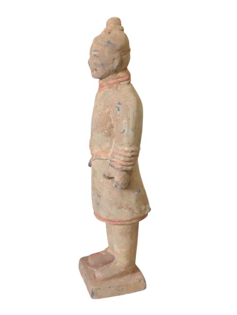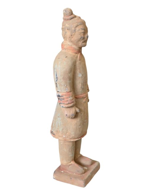 Guerrero en uniforme de batalla: Estas estatuas representan una categoría de soldado entre las estatuas de terracota del ejército. Generalmente se representan como soldados vestidos con ropa de batalla sencilla. En comparación con otros tipos de guerreros de terracota, suelen llevar menos equipo y condecoraciones. Estos soldados probablemente eran soldados de infantería, encargados de guardias y otras tareas militares generales, en lugar de comandantes superiores o miembros de fuerzas especiales. Su representación podría reflejar la imagen típica de los soldados rasos del antiguo ejército chino, con vestimenta sencilla pero con un coraje y una determinación inquebrantables.