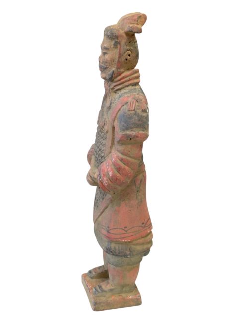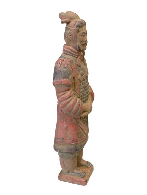 Las estatuas de terracota de guerreros y caballos, de gran realismo, representan fielmente su apariencia en el momento de su descubrimiento. El proceso de envejecimiento es mucho más complejo que el de las estatuas comunes, requiriendo un trabajo meticuloso y una cantidad considerable de tiempo. Para lograr una apariencia auténtica, deben enterrarse durante un tiempo, luego desenterrarse, exponerse a la intemperie y restaurarse. Solo después de este proceso de erosión natural se puede lograr un efecto realista. Por lo tanto, su valor es considerablemente alto debido a la complejidad y autenticidad del proceso de fabricación.