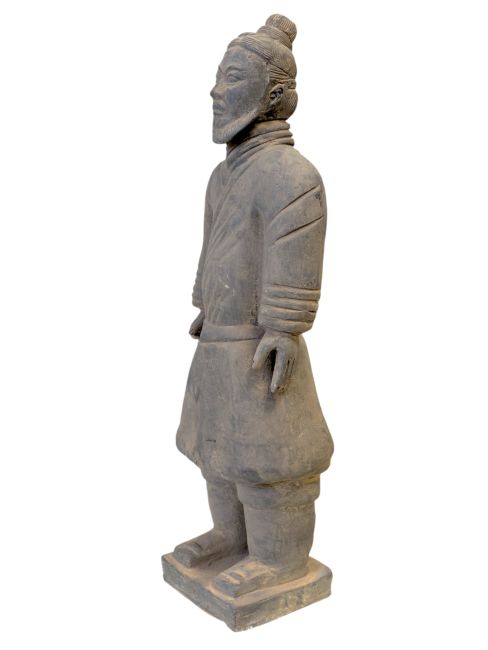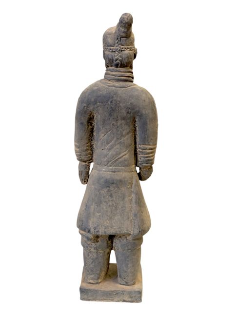 Guerrero en uniforme de batalla: Estas estatuas representan una categoría de soldado entre las estatuas de terracota del ejército. Generalmente se representan como soldados vestidos con ropa de batalla sencilla. En comparación con otros tipos de guerreros de terracota, suelen llevar menos equipo y condecoraciones. Estos soldados probablemente eran soldados de infantería, encargados de guardias y otras tareas militares generales, en lugar de comandantes superiores o miembros de fuerzas especiales. Su representación podría reflejar la imagen típica de los soldados rasos del antiguo ejército chino, con vestimenta sencilla pero con un coraje y una determinación inquebrantables.
