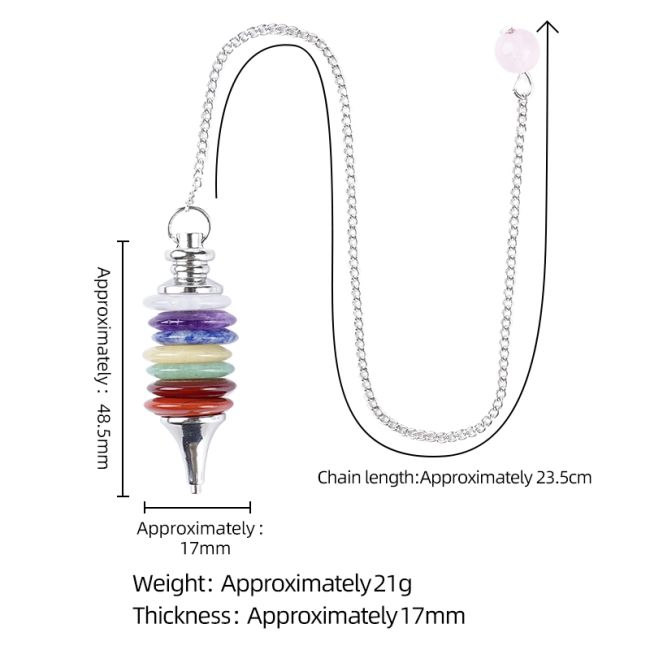 Péndulo de adivinación elaborado con piedras naturales compuesto por siete discos apilados, que representan los colores tradicionalmente asociados a los chakras.