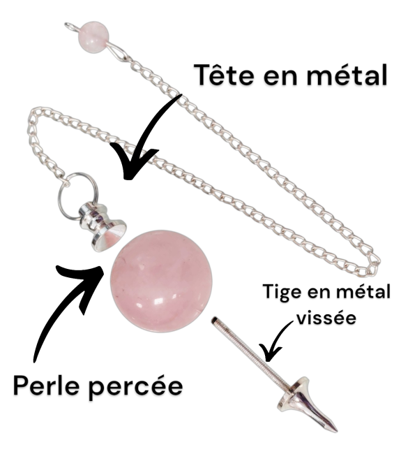 La cuenta y el péndulo, ambos tallados en la misma piedra natural, tienen un orificio central que permite insertar y atornillar una varilla metálica, garantizando así resistencia y durabilidad.
